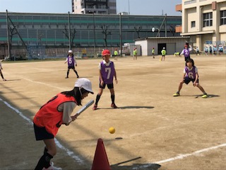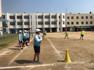 久しぶりの暖かい日差しの中、体育の学習では楽しくハンドベースボールを行いました。野球のルールを知らなくても、上手にできなくてもみんなが楽しめるように、少しルールを変えています。