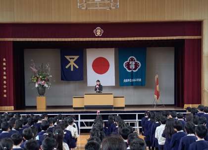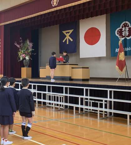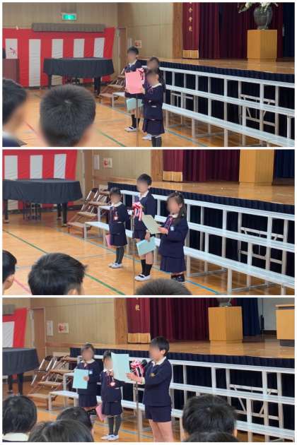 1年生と4年生の代表の人が、1年間の振り返りの作文を読んでくれました。凧上げや、かけあし大会のことなど、楽しかったことや頑張ったことをしっかり発表してくれました。
