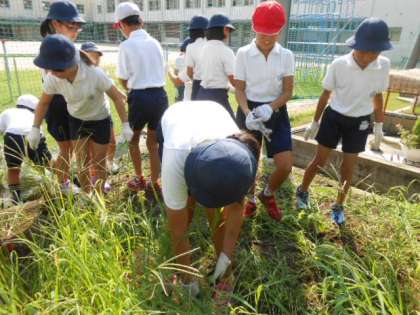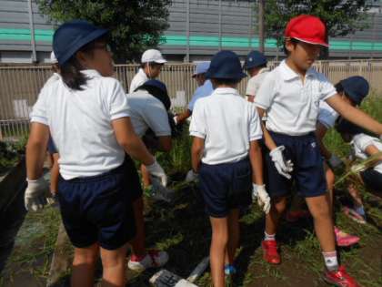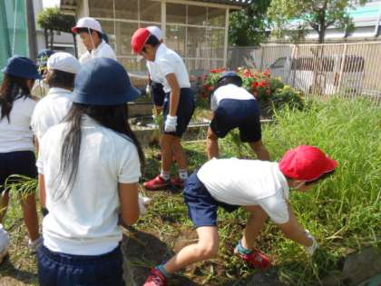 5年1組の子どもたちが、みんなで力を合わせて草むしりをしていました。