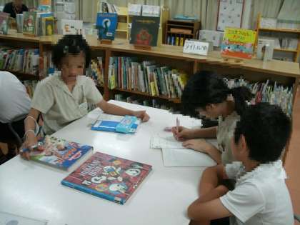 グループの友達と、本を囲んで相談したり、一緒にワークシートに書き込んだりしていました。