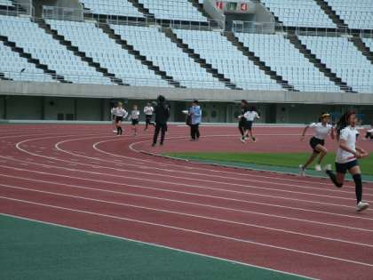 学校の運動場とは違い、直線で100mを走るのは子どもたちにとって新鮮な経験でした。