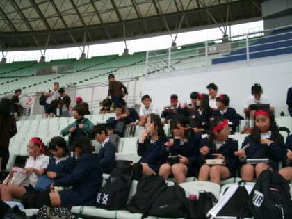 客席でお弁当を食べた後、午後からは、隣の競技場に移動し、ドッジボール、サッカー、大縄跳びを楽しみました。