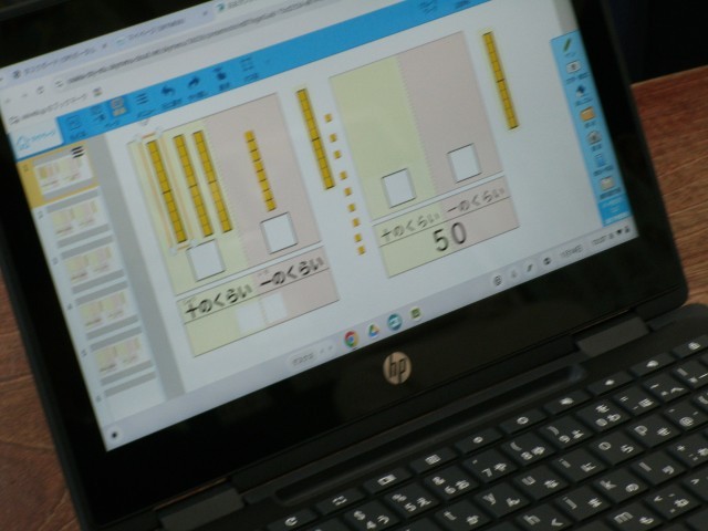 学習者用端末を使って、問題の数字にあわせて画面上のブロックを動かしていました。