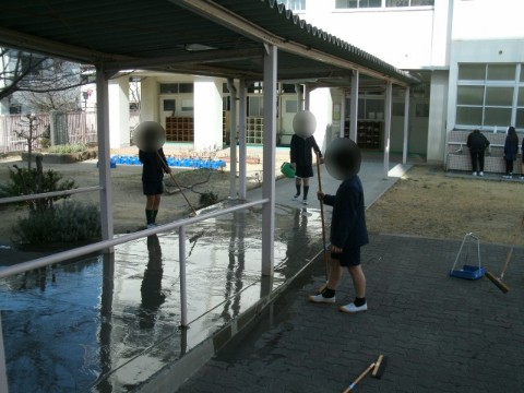 玄関の本棚を動かして掃除したり、渡り廊下に水をまいたりと、普段は掃除を行わない場所にも気を配って丁寧に掃除をしました。