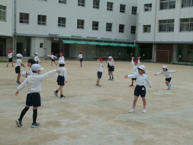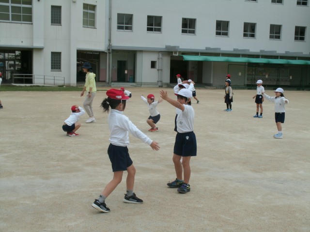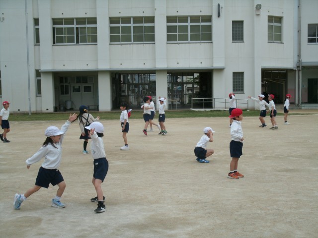じゃんけんぽん、あいこでしょ。2年生の子どもたちの元気な声が運動場に響いています。みんなでじゃんけんをしています。でも普通のじゃんけんではありません。からだ全体を使ってグー・チョキ・パーを表しています。合図と同時にからだを大きく動かします。「勝ったー」「負けたー」…とても楽しそうにしています。遊びの様子を含んだ運動に親しむことで、子どもたちの気持ちが大きく解放されます。これからもいろんな工夫を考えていきます。
