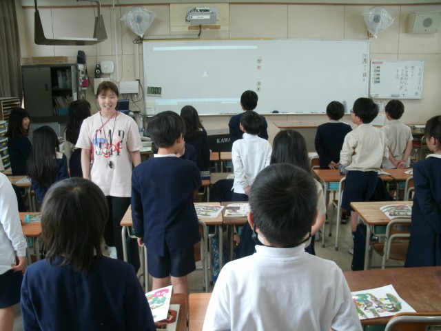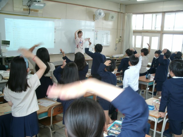 何をしているのかな?3年生の音楽の授業の様子です。子どもたちが歌う前にまずは発声練習です。先生の指導がおもしろくて子どもたちもノリノリです。まずはみんなでミッキーマウスになります。ミッキーの声ってとても高いですよね。みんなミッキーになりきります。頭の上から声を出す感覚でやります。次はポテトチップスをたてにして食べるのか横にして食べるのかで口の開け方の感覚に結びつけていきます。先生の楽しい指導に子どもたちも自然と大きな声を出して、すてきな声を出すことを意識しながら歌うことができていました。