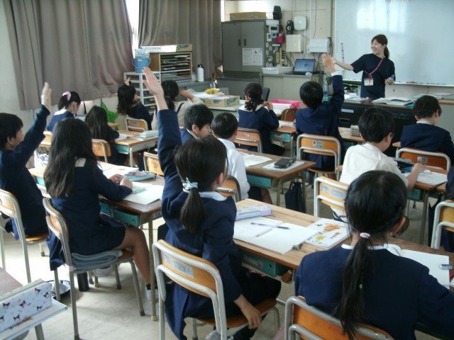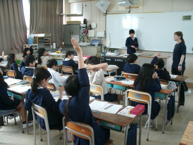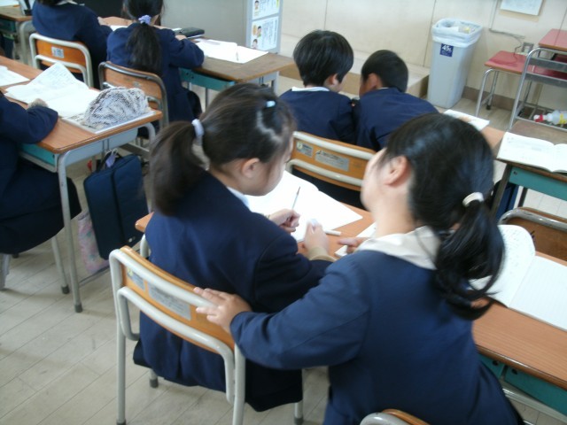 3年生の子どもたちが算数の授業で計算の仕方を考えています。2年生までに習った内容を生かして、何とか解決する方法をないだろうかとみんなで頭を悩ませていました。先生が「自信がなくても思いきって発表してみよう」と声をかけると、それを合図に手があがりはじめます。「他にも違う考え方がありますか」と先生が言うと、またまた手があがります。みんな発表したいという気持ちがいっぱいあるんですね。となりのお友だちと話し合うこともできていました。とてもすばらしいですね。