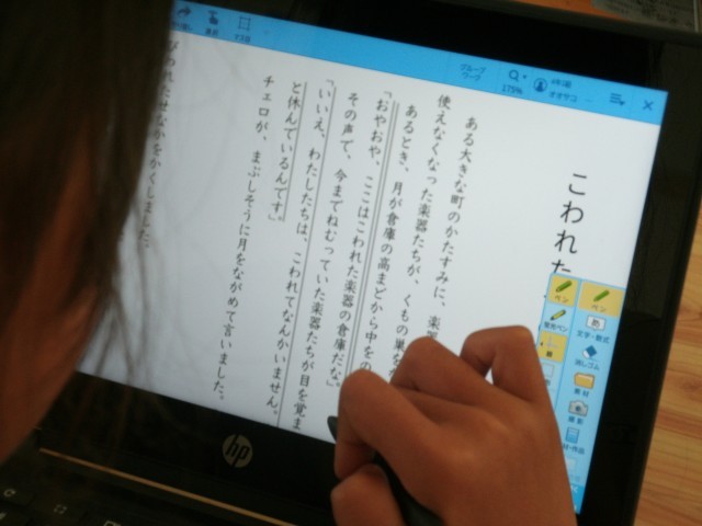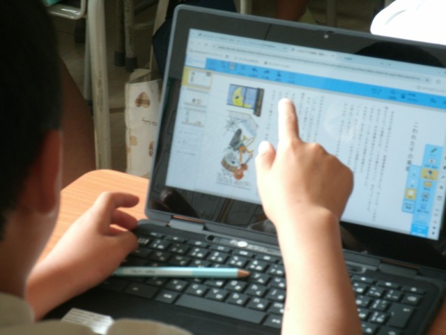 4年生の子どもたちが国語の授業でタブレットを使っていました。画面には物語の文章が映し出されていて、先生と一緒に画面上で線を引いたりチェックを入れたりしていました。線の種類や色も変えることもできます。登場人物の会話に注目して、どんなふうに読んだら気持ちがよく伝わるだろうかと話し合いもしていました。実際に読んでみて、「う~ん、ちょっと違うかな?」となったら、また別の読み方も考えていました。教室にはさわやかな春の風が吹き込んでいます。