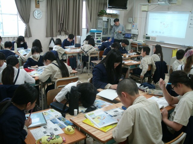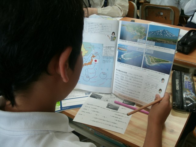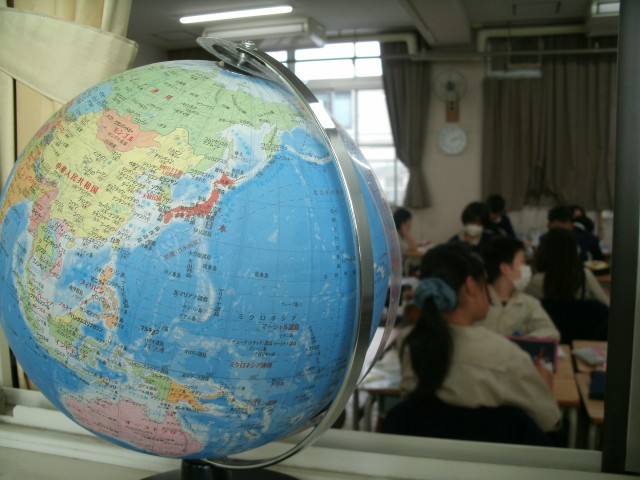 地球儀の向こうでは、5年生の子どもたちが社会の授業で「日本の国土」について学習していました。日本はまわりを太平洋や日本海などの海に囲まれている島国です。北海道、本州、四国、九州の4つの大きな島と沖縄をはじめとする多くの島々が南北に弓のように連なってできています。子どもたちは地図を見ながら、日本の国土のようすについて確認していきます。東西南北における最も端にある島は何島ですか?…子どもたちは答えられません。大人でも知らない人がほとんどですね。最東端は南鳥島、最西端は与那国島、最南端は沖ノ鳥島、最北端は択捉島です。「で、それどこなん?」…ということで子どもたちはまたグループで協力しながら探し始めます。