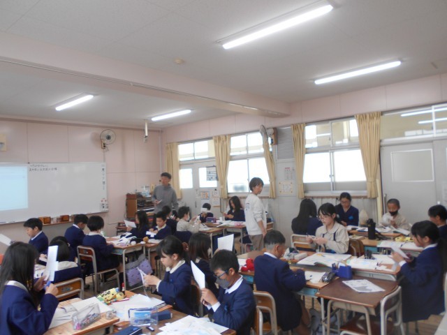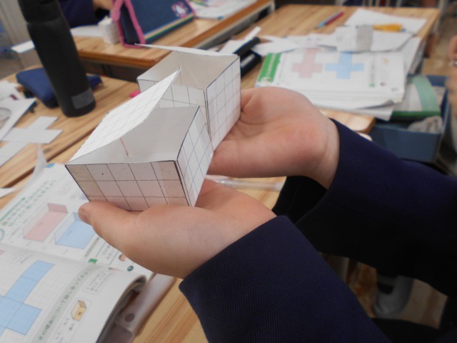 5年生の子どもたちはこれから算数の学習において「立体」のかさ(体積)について学習していきます。まずはじめに「直方体」と「立方体」です。その前に…直方体ってどんな形?立方体ってどんな形?。みんなで作ってみることにしました。展開図が描かれた画用紙をはさみで切って組み立てていきます。だんだん箱が出来あがっていきます。「ティッシュの箱やん」「サイコロやん」…身のまわりにもよくある形ですね。実際に作ってみるとわかりやすいです。次からはかさ(体積)について調べていきます。