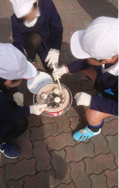 七輪で焼いたおもちは、砂糖と醤油で食べました。 赤白帽でAチームとBチームに分...