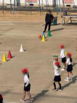 1年 体育 赤組と白組の列の間にコーンを並べて、まとあてゲームをしました。 ...
