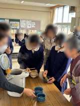 6年生の授業では、お茶を飲んだ後、代表の児童がお茶を点てる体験をしました。 お...