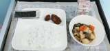 今日の献立は、金時豆の中華おこわ、中華スープ、みかん、コッペパン、ブルーベリー...