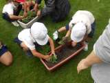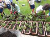 地域の方といっしょに花の苗を植えました。 ビオラとノースポールの苗です。