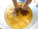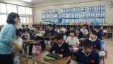 1年生は1・2組合同で目に見えない汚れを見えるようにして「正しい手の洗い方」を学...
