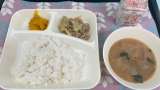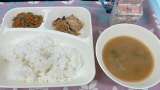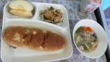 今日の献立は、豚肉と野菜の炒め物、イワシのつみれ汁、カボチャういろう、ご飯、牛...