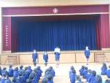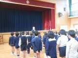 今日の児童集会は英語集会です。 舞台上で集会委員が数を数えています。 ストップと...