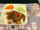 今日の献立は、ハヤシライス、キャベツのバジル風味サラダ、みかん(缶)、牛乳です...