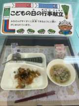 今日の献立は、きんぴらちらし、すまし汁、ちまき、牛乳です。ちまきは喉につめない...