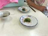 サラダのドレッシングは、ごま油を加えた中華風です。各グループで工夫して盛り付けて...