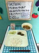 今日の献立は、ちくわの磯辺揚げ、厚揚げと里芋の煮物、あっさりキャベツ、ごはん、...