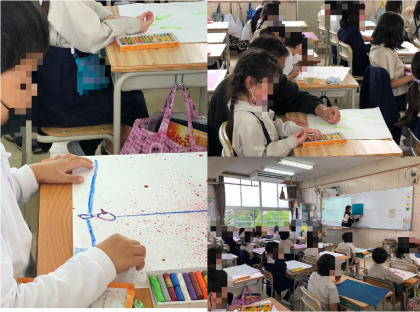 2年生の図工です。昨日の続きをしています。昨日着色した画用紙にクジャクを書いて...