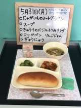 今日の献立は、ジャガイモのミートグラタン、スープ、キュウリのバジル風味サラダ、...