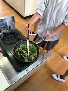 小松菜とコーンとベーコンの炒め物を作りました。慎重に包丁を使って、小松菜を切りそろえ食べやすい大きさに切ることができました。炒め方も火加減や時間に気を使い、上手に調理することができました。