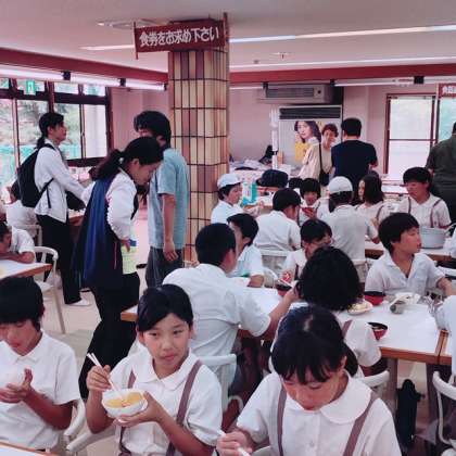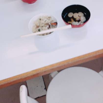 お昼ご飯の時間です。メニューは山菜ごはんです。みんなで食べる食事もこれで最後です。