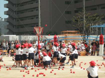 運動会のお楽しみPTAの「おたまでダッシュ!!」は、今年も職員チームが勝ちました。