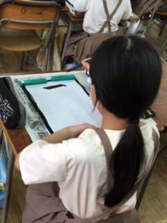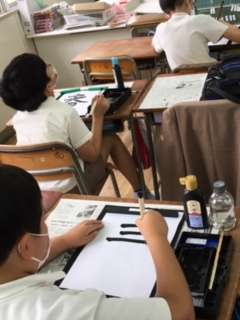 5年2組の教室では、毛筆で「春」という字を書いていました。