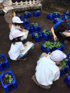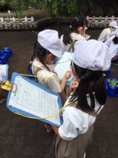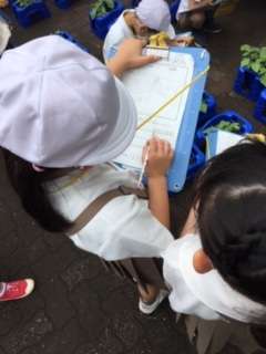 雨がやんでいたので、1年生が、あさがおの観察をしました。しっかり見て、記録していましたよ。