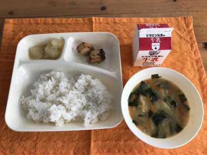 さけのつけ焼き、みそ汁、とうがんの煮もの、ごはん、牛乳