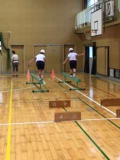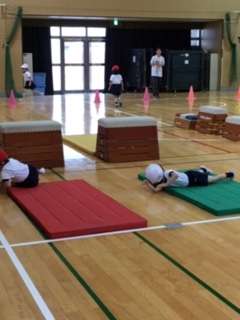 体育の時間の様子です。マットや跳び箱、平均台、フラフープなどを並べているところを、児童は転がったり、走ったり、超えたり、回したりと、とても楽しそうです。