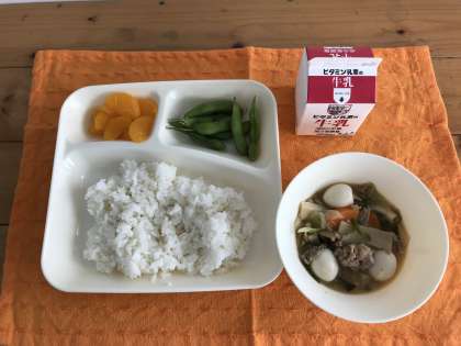 八宝菜、枝豆、みかん(缶づめ)、ごはん、牛乳