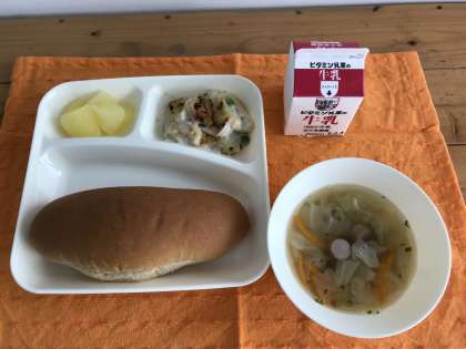 マカロニグラタン、スープ、りんご(カット缶)、黒糖パン、牛乳