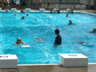 ビート板を使って平泳ぎの足の動きの練習と、25mプールを平泳ぎで、どんどん泳ぐ練習をしていました。