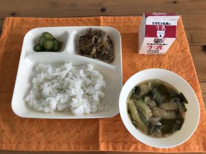 豚肉のごまだれ焼き、五目汁、きゅうりのおかかあえ、ごはん、牛乳