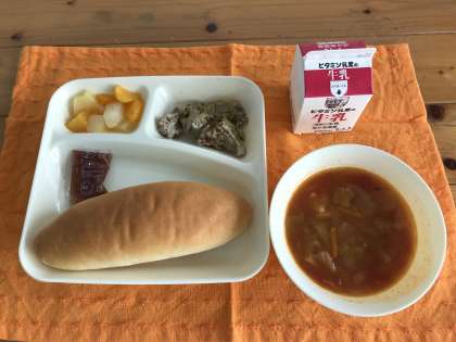 「豚肉のカレー風味焼き」は、カレー味で豚肉が食べやすかったです。「ミネストローネ」は、トマト味のスープです。生のトマトは、嫌いな児童が多いのですが、スープに入れると、喜んでお代わりをしていました。トマトは、熱を加えると、旨味に変わります。トマト味のスープをおいしく感じられるのは、しっかり味わえている印ですね。(栄養教諭)