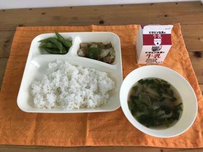ホイコウロー、中華スープ、えだまめ、ごはん、牛乳