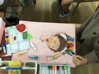 図画工作の時間です。人物の表情も豊かに描けていて感心しました。