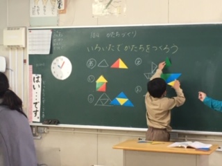 算数の時間に、いろいたで形を作る学習を行っていました。船の形にチャレンジしていました。