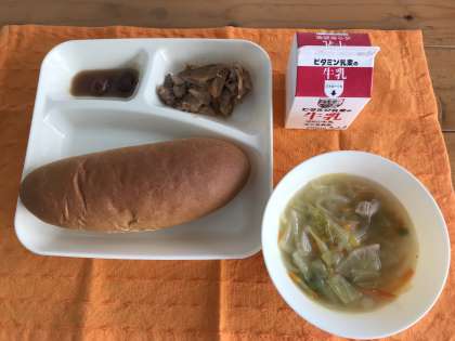 豚肉のデミグラスソース、スープ、うずら豆のグラッセ、黒糖パン、牛乳