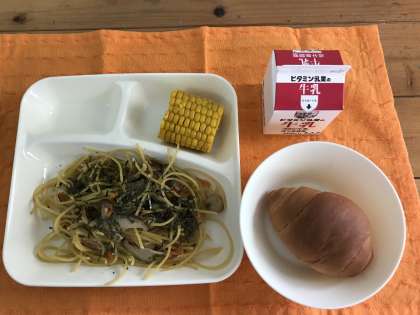 ウインナーときのこのしょうゆスパゲッティ、焼きとうもろこし、黒糖パン(小)