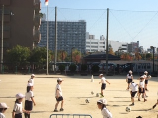 今日は、体育の時間にサッカーボールを使って、「ボール遊び」をしていました。うまく蹴れたかな。