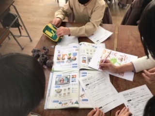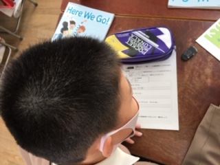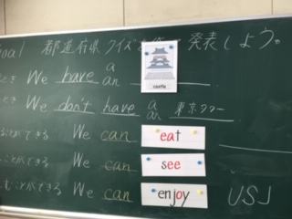 英語の時間です。都道府県クイズの問題を班ごとに書いていました。