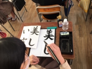 習字の時間です。姿勢を正して、ゆっくり丁寧に書くことを指導されています。