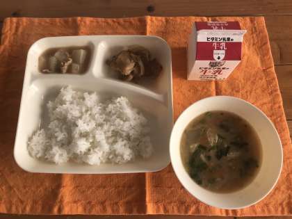 鶏肉の甘辛焼き、みそ汁、だいこんの煮もの、ごはん、牛乳
