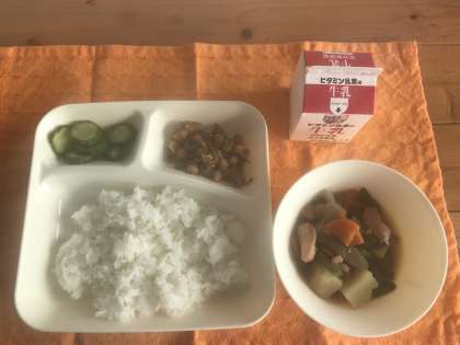 鶏肉と野菜の煮もの、じゃこ豆、あっさりきゅうり、ごはん、牛乳